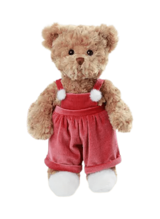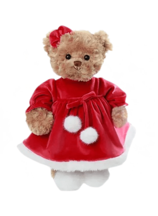 Zachte berenknuffel met een rood velours pakje aan van 35cm.