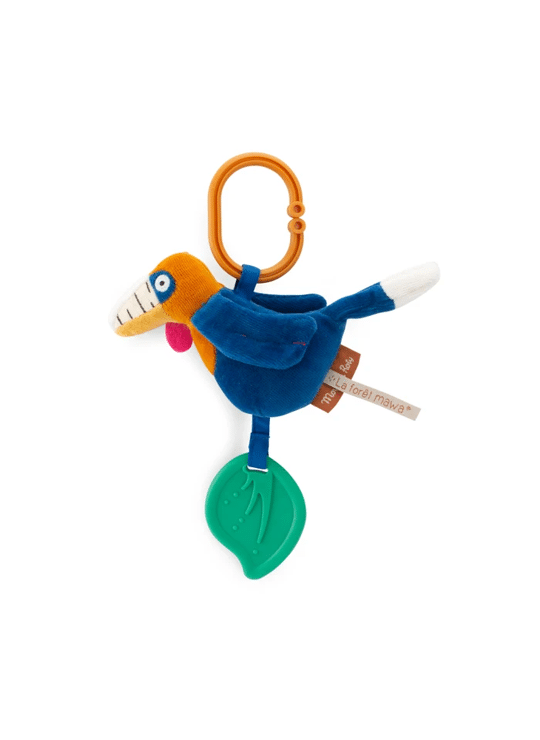 Een kleurrijke hangende neushoornvogel met een belletje in zijn buik en vleugels die knisperen. Er zit ook een bladvormig bijtspeeltje bij.