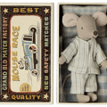 Een klassiek Maileg-item. Dit muisje is klaar voor uren speelplezier en slaapt knus in het kleine luciferdoosje. De kleertjes en het beddengoed zijn gemaakt van zachte stoffen met unieke prints in prachtige kleuren. Breid het verhaal uit door accessoires toe te voegen aan het spel.