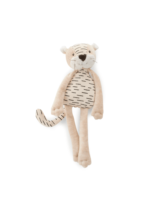 De rammelaar Baboo de tijger, met zijn lange, makkelijk vast te pakken poten en zachte, knuffelbare lijfje. Uitgerust met een belletje, kan de baby ermee schudden om mee te spelen op het ritme van de muziek!